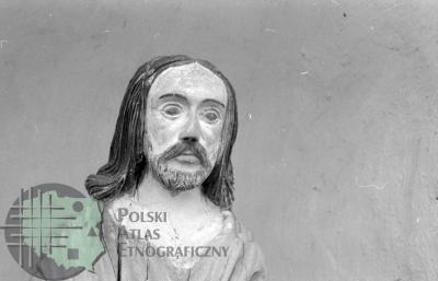 fotografie przedstawiają drewnianą rzeźbę Jezusa we wnętrzu przydrożnej kapliczki (1, 2, ) oraz ogólny widok kapliczki (3) oraz Uwaga:- lokalizacja na mapie jest przybliżona -