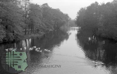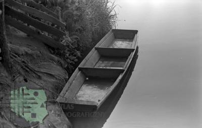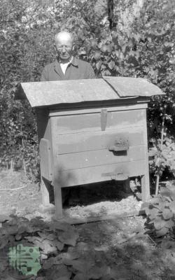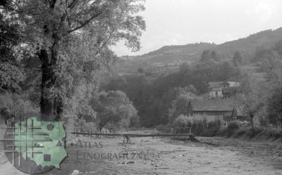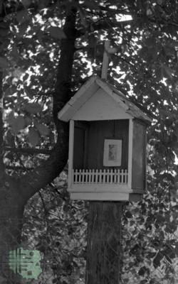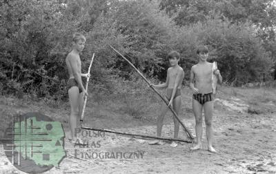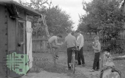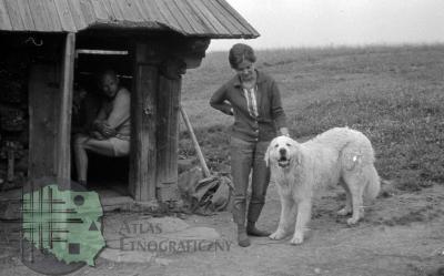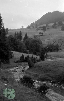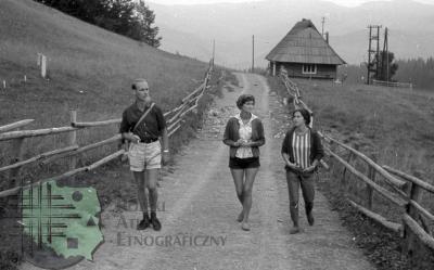 fotografia przedstawia płoty z poziomych żerdzi; między nami na drodze widać idącego mężczyznę i dwie kobiety: od lewej: Mieczysław Mazurkiewicz (kuzyn Z. Kłodnickiego, bibliotekarz), Elżbieta Mazurkiewicz (żona M. Mazurkiewicza, bibliotekarka) i Jadwiga Gerlach-Kłodnicka (żona Z. Kłodnickiego, etnolog)