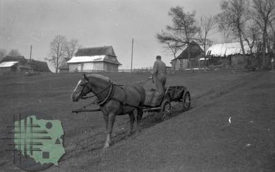 fotografia przedstawia zaprzęg jednokonny (w chomąto) w wozie roboczym, na którym stoi mężczyzna