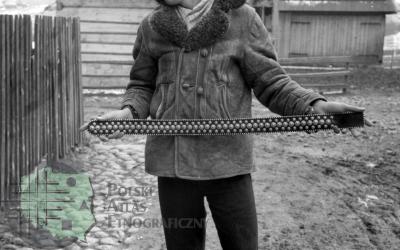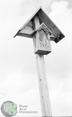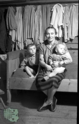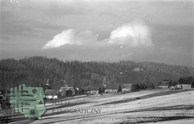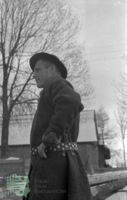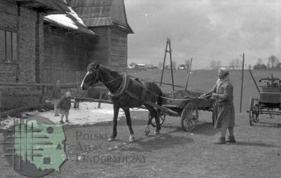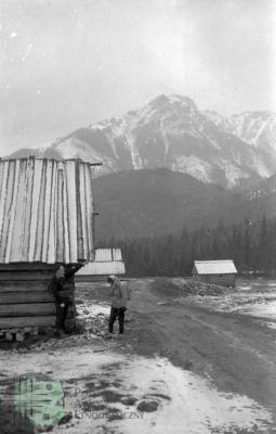fotografia przedstawia sanie wyjazdowe (z woźnicą) przygotowane do wyjazdu do Zakopanego - w saniach siedzą dwie kobiety, obok nich stoi mężczyzna w kapeluszu i wełnianych spodniach, w tle zabudowania drewniane