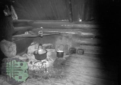 fotografia przedstawia watrę (ognisko z metalowym trójnogiem) i sprzęty w szałasie. Uwaga:- lokalizacja na mapie jest przybliżona -