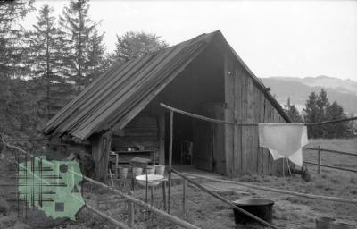 fotografia przedstawia szałas pasterski, obok którego stoi mężczyzna mężczyznę w kapeluszu i spodniach wełnianych. Uwaga:- lokalizacja na mapie jest przybliżona -