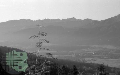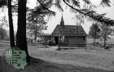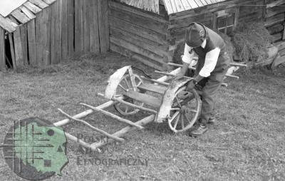 fotografia przedstawia mężczyznę naprawiającego wózek dwukolny przed drewnianym budynkiem gospodarczym Uwaga: Blachówka jest obecnie częścią wsi Kościelisko