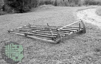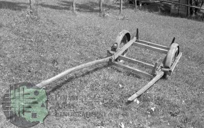 fotografia przedstawiają ręczny wózek dwukolny z dwoma dyszelkami i dwa zbliżenia fragmentów wózka na łące Uwaga: Blachówka jest obecnie częścią wsi Kościelisko