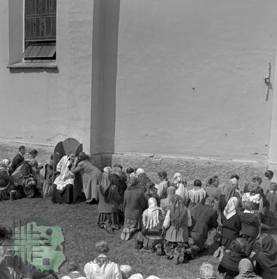 fotografie przedstawiają ludzi klęczących przed kościołem w czasie odpustu w Sanktuarium Wniebowzięcia Najświętszej Marii Panny w Ludźmierzu ( 15 sierpnia) ( 1,2)