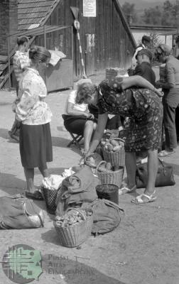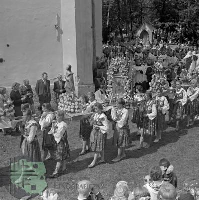 fotografie przedstawiają dziewczęta w strojach podhalańskich niosące feretrony podczas procesji z okazji odpustu w Sanktuarium Wniebowzięcia Najświętszej Marii Panny w Ludźmierzu ( 15 sierpnia) (1,2)
