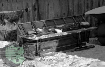 cykl 5 fotografii przedstawiających sanie wyjazdowe, kolejno w ujęciach widok od spodu, mocowanie dyszla (widok z góry), umocowanie dyszla w saniach (widok z dołu), widok sań z góry, widok z dołu i od tyłu