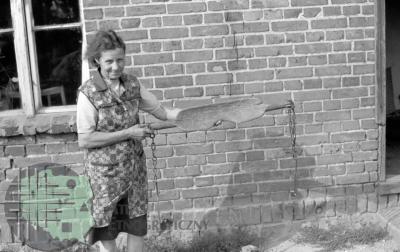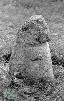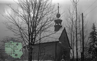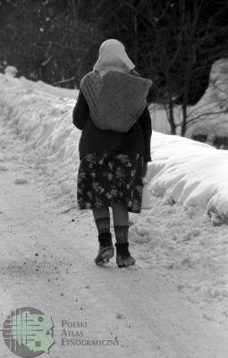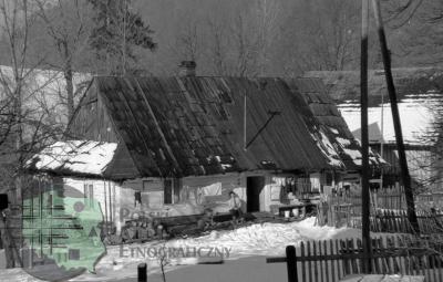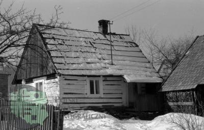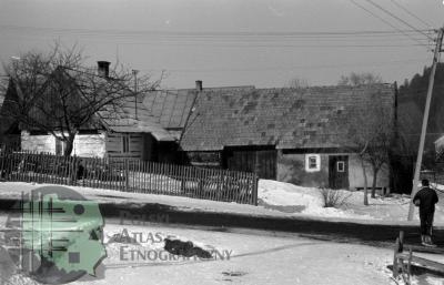 fotografia przedstawia drewnianą kapliczkę skrzynkową na słupie; w głębi widać budynek mieszkalny i zbocze góry (zimą). W kapliczce widoczna jest rzeźba Chrystusa Frasobliwego