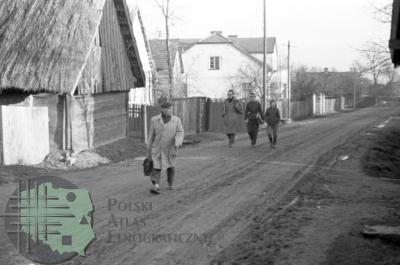 fotografia przedstawia kilka idących przez wieś osób, wśród nich badacze: Adolf Nasz i Henryk Szymczak. Uwaga:- zdjęcie powstało w trakcie miesięcznych badań archeologiczno-etnologicznych, w których uczestniczyli również studenci etnologii (w tym Zygmunt Kłodnicki) prowadzeni pod kierunkiem naukowym Adolfa Nasza -