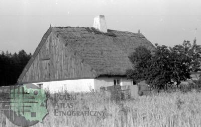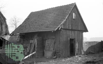 fotografia przedstawia budynek gospodarczy o konstrukcji węgłowej ścian, na zdjęciu widoczny jest także fragment zagrody i ogrodzenie. Uwaga:- zdjęcie powstało w trakcie miesięcznych badań archeologiczno-etnologicznych, w których uczestniczyli również studenci etnologii (w tym Zygmunt Kłodnicki) prowadzeni pod kierunkiem naukowym Adolfa Nasza -