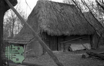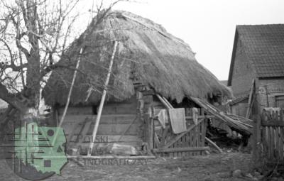 fotografia przedstawia budynek gospodarczy o konstrukcji węgłowej ścian, w głebi widoczne zabudowania wiejskie. Uwaga:- zdjęcie powstało w trakcie miesięcznych badań archeologiczno-etnologicznych, w których uczestniczyli również studenci etnologii (w tym Zygmunt Kłodnicki) prowadzeni pod kierunkiem naukowym Adolfa Nasza -