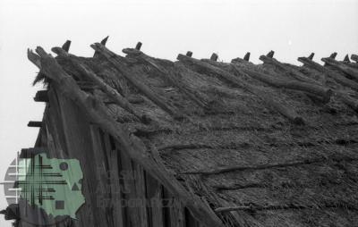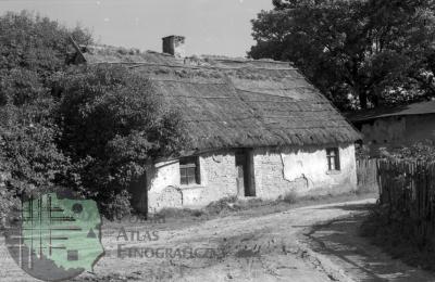fotografia przedstawia fragment ściany domu mieszkalnego z oknem. Dom o konstrukcji ryglowej ścian (mur pruski) kryty słomą. W oknie widoczne są firanki