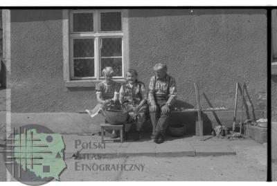 cykl 5 fotografii przedstawia mężczyznę (rybaka) oraz chłopca (Wojciech Kłodnicki) trzymających samołówkę rybacką typu wiersza (kombinacja - połączenie trzech wierszy jednoskrzydłowych typu "kozak") - widok na całość narzędzia oraz na poszczególne części urządzenia
