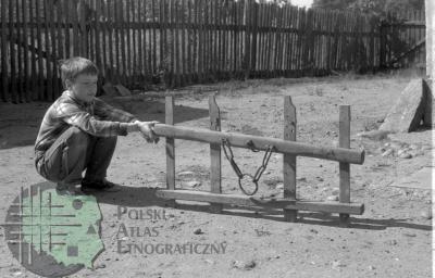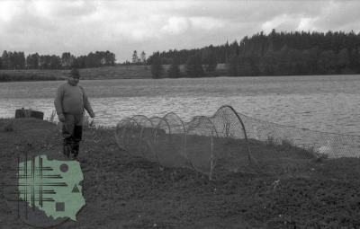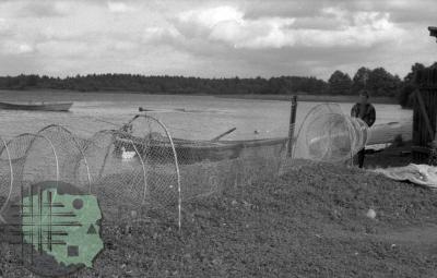 fotografia przedstawia chłopca (Wojciech Kłodnicki) trzymającego samołówkę rybacką (mieroża) połączoną skrzydłem z drugą mierożą; w tle na jeziorze widać łodzie rybackie