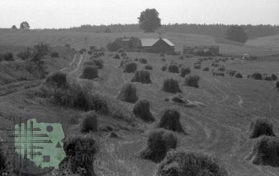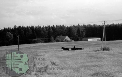 dwie fotografie przedstawiają widok na wieś Krojanty widziany od strony pól uprawnych, w oddali zabudowania wiejskie. Zdjęcia zrobione w różnych oświetleniach