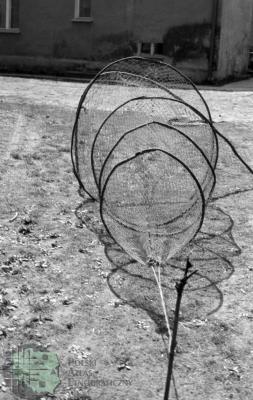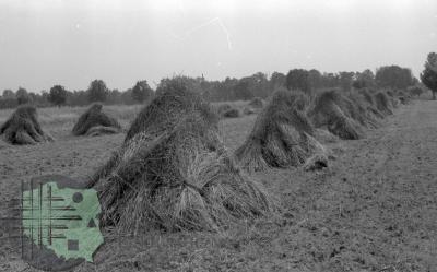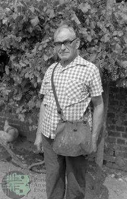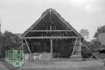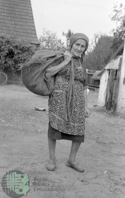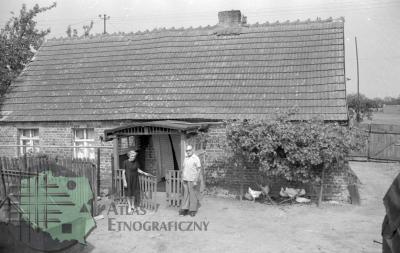 fotografia przedstawia mężczyzn i kobiety (informatorzy) w ubiorach codziennych, którzy stoją przed budynkiem mieszkalnym. Uwaga:- fotografia powstała w trakcie badań etnologicznych po 1 roku studiów Z. Kłodnickiego (praktyka terenowa pod kierunkiem Adolfa Nasza)
