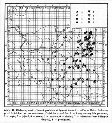 Obdarowywanie różnymi produktami żywnościowymi dziadów w Dzień Zaduszny przed kościołem lub na cmentarzu/ Komentarze do Polskiego Atlasu Etnograficznego (mapy)